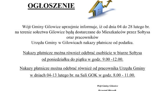 Wójt Gminy Gilowice uprzejmie informuje, iż od dnia 04 do 28 lutego 2026 roku na terenie sołectwa Gilowice będą dostarczane do Mieszkańców przez Sołtysa oraz pracownikówUrzędu Gminy w Gilowicach naka...